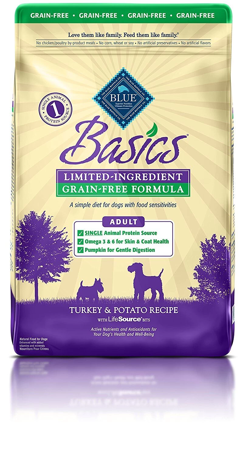 Grain-free BLUE Basics is a limited-ingredient diet formulated to minimize food sensitivities that some dogs experience while maximizing the nutritional value they receive. 24lb bag. BLUE Basics contains: