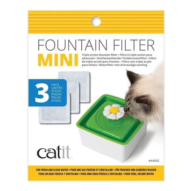 The Catit Mini Fountain Filters collects large particles and debris, while the activated carbon helps reduce odors and absorbs impurities. The Catit Mini Fountain Filters are to be used with the Catit Mini Flower Fountain (43735W) and need to be replaced monthly.