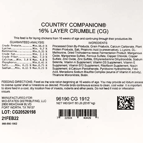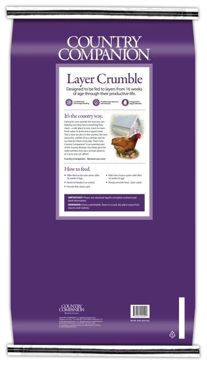 Country Companion Layer Crumble is chicken feed designed to be fed to layers from 16 weeks of age through their productive life. The crumbled form is designed to be easier for hens to consume than the pelleted feed. It has all the necessary ingredients for the nutritional needs of hens with no need for additional supplements. It contains 16% protein and is fortified with vitamins and minerals, which are used to promote egg production and flock health. This crushed up formula is designed to encourage hens to eat and increase the quality and number of eggs produced due to the natural health of the hens.