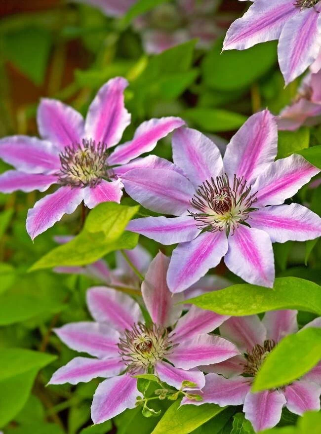 The Nelly Moser Clematis produces a profuse number of showy, pale mauve-pink blooms. Each bloom has eight petals and is 7-8” in diameter.