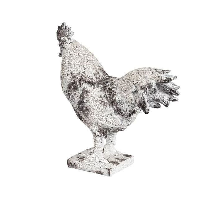 Add a rustic touch to any outdoor space with this rooster garden statuary. Measuring 10.5 inches tall, this chicken features a distressed white finish that adds to its vintage appeal. Crafted from polyresin with a glaze finish, this statuary is completely weather-resistant and ideal for outdoor use. Perfect for a farmhouse aesthetic, this statue will bring rustic charm to any space.