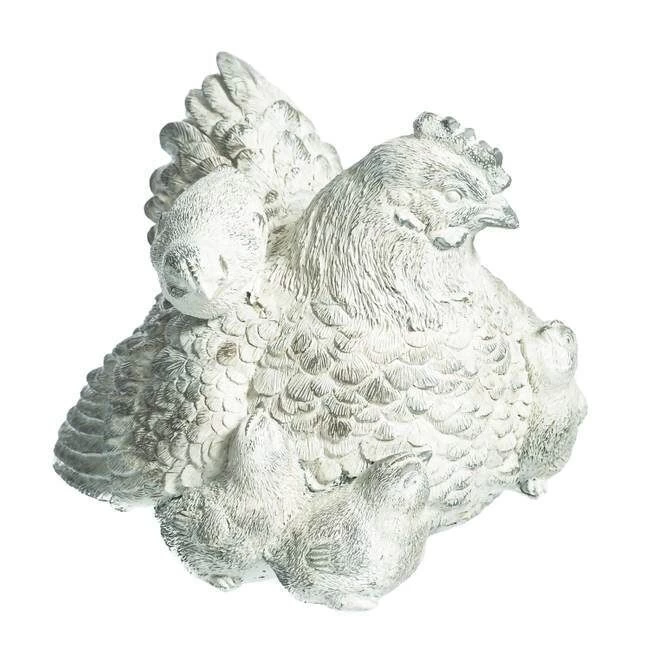 Add a rustic touch to any outdoor space with this mother hen garden statuary. Measuring 8.5 inches wide 6.5 inches tall, this mama chicken with her chicks features a distressed white finish that adds to its vintage appeal. Crafted from polyresin with a glaze finish, this statuary is completely weather-resistant and ideal for outdoor use. Perfect for a farmhouse aesthetic, this statue will bring rustic charm to any space.