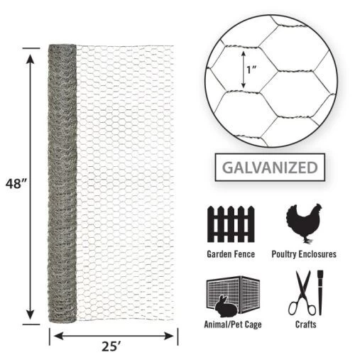 48in H x 25ft W Galvanized Hex Netting features a 1in hexagonal mesh weave design and is both lightweight and easy to use. The hex netting is galvanized with a zinc coating for added durability and to help prevent rusting. Chicken wire has many uses such as animal containment, plant protection and support, fencing applications, and many more.