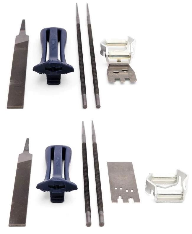 Everything you need to sharpen your chain with. Complete with file handle, combination file guide (roller file guide and depth gauge in one), 2 round files, and 1 flat file for depth gauges. The combination gauge helps ensure the correct filing angle and simplifies the filing process.
