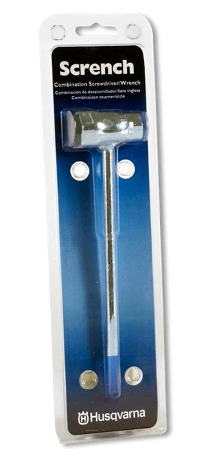 Standard combination bar nut wrench and screwdriver. One side of the wrench can be used to remove spark plugs on all 2-stroke handheld equipment, the other can be used to tighten/loosen bar nuts on the side cover of chainsaws. The screwdriver is multi-purpose.