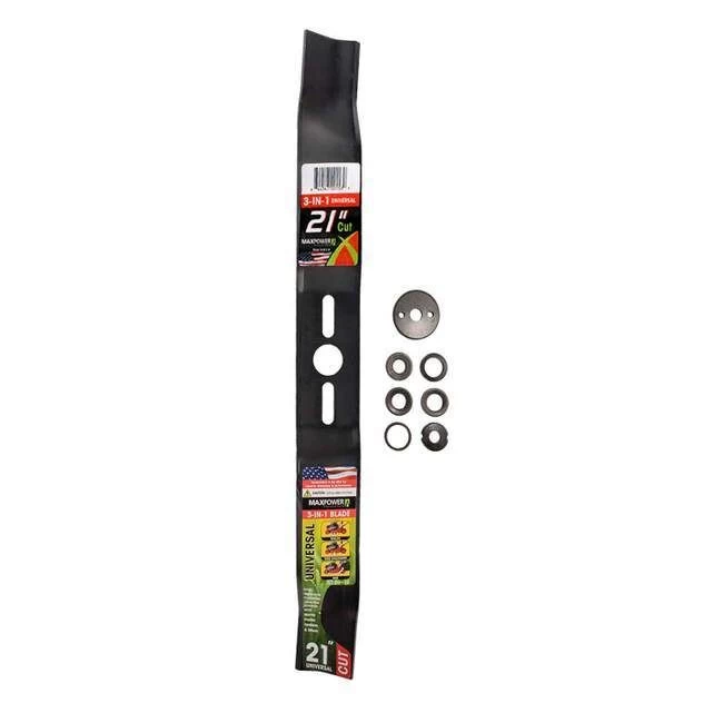 MaxPower’s 331951S includes (1) 21 in. universal 3-in-1 mower blade. This blade measures 21 in. L and 2-1/4 in. W with a 1 in. center hole. It includes a cover washer and 6 reducing washers in the following sizes: 3/8 in., 7/16 in., 9/16 in., 1/2 in., 5/8 in. and 3/16 in. MaxPower blades are proudly manufactured to meet or exceed OEM specifications.MaxPower’s 331910S includes (1) 22 in. universal mulching replacement lawn mower blade. This blade measures 22 in. L and 2-1/4 in. W with a 1 in. center hole. It includes a cover washer and 6 reducing washers in the following sizes: 3/8 in., 7/16 in., 9/16 in., 1/2 in., 5/8 in. and 3/16 in. MaxPower blades are proudly manufactured to meet or exceed OEM specifications.