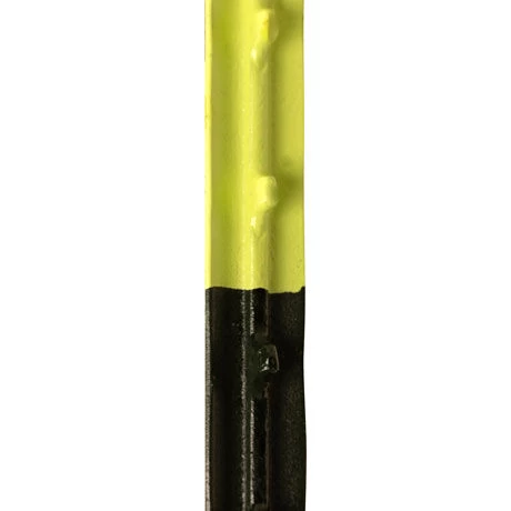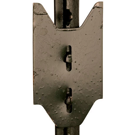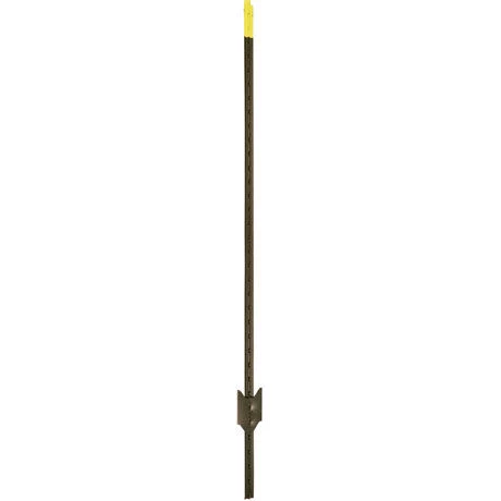 This studded t-post manufactured by Nucor Steel Utah is painted with a dark green enamel for added weather resistance and tipped with a high visibility lime green top. The studs are evenly spaced along its length and are angled to help hold the fence against the post. The large anchor plate near the bottom is designed to provide greater stability when inserted in the ground.