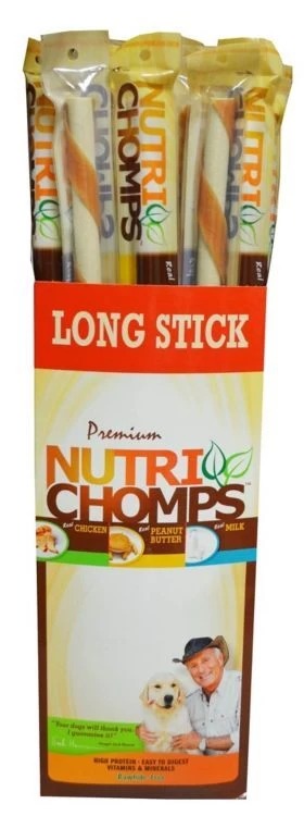 Premium Nutri Chomps 15″ Peanut Butter Wrapped Long Sticks are rawhide-free dog chews. Veterinary Recommended Premium Nutri Chomps are safe & healthy dog bones. . In 2012, The University of Illinois College of Veterinary Science conducted a study which proved pork skin to be fully digestible and significantly more digestible than beef rawhide. Jungle Jack Hanna has endorsed the Premium Nutri Chomps brand as a safe and healthy rawhide alternative. Peanut Butter Wrapped Mini Twists are perfect for Miniature Dogs, Small Dogs, and Medium Dogs.