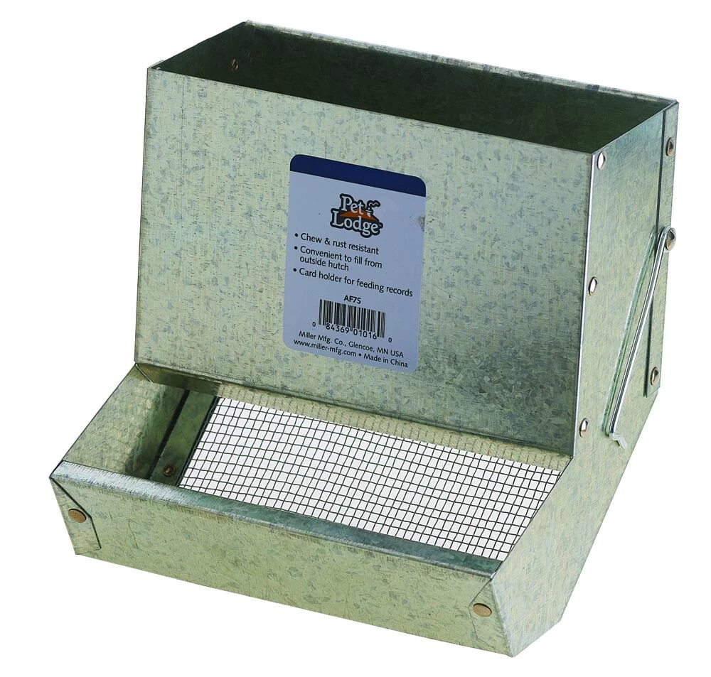 Rabbits and other small animals will not eat the fines (powdery residue) that collect in pelleted or grain feeds. If left in the feeder, these can attract harmful molds. This rabbit and small animal feeder has a wire mesh bottom that sifts fines out so they fall into the litter below. Includes independent wire hooks so the feeder can be attached to the inside of the hutch, or for more convenient filling to the outside with some wire cutting. Gravity design allows feeder to dispense several days worth of feed a little at a time. Made of chew-proof, rust-resistant, heavy-gauge galvanized steel. Measures 5.5 inch long by 7.125 inch wide by 7.125 inch high.