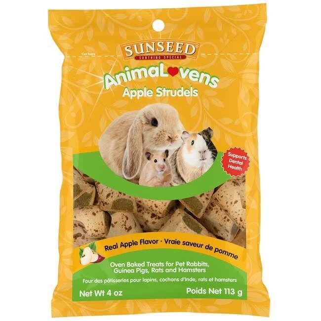 Oven-baked, natural apple treats with a hard crunchy texture that help with small animals’ tooth conditioning. AnimaLovens® Apple Strudels are baked for that ideal texture your pet loves and needs to gnaw on to maintain strong, healthy teeth. The combination of real fruit, vegetable, and whole grain ingredients make them both delicious and nutritious.