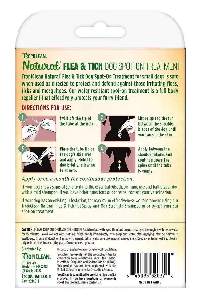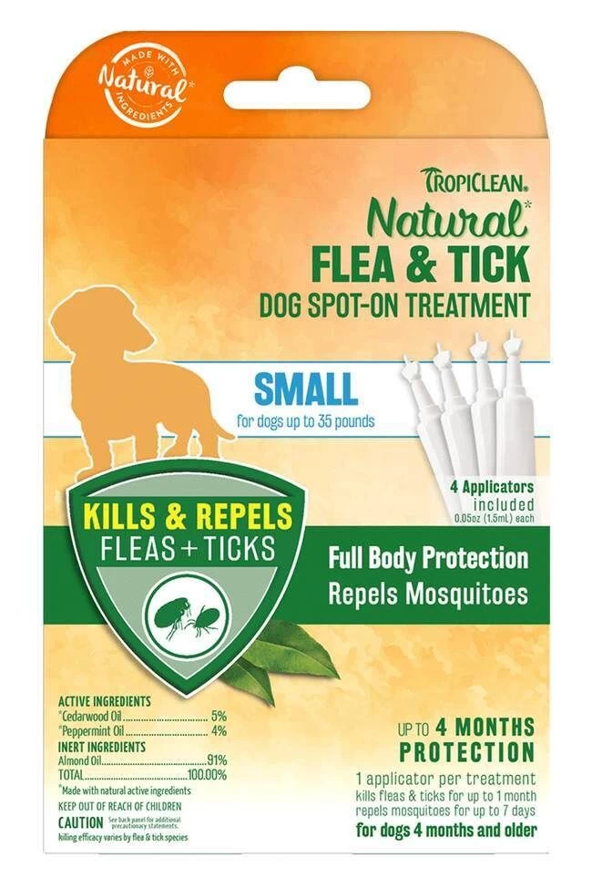 TropiClean Natural Flea & Tick Dog Spot-On Treatment for small dogs is made with natural active ingredients, cedarwood and peppermint oils, and is safe when used as directed to protect and defend against those irritating fleas, ticks and mosquitoes. Our water resistant spot-on treatment is a full body repellent for dogs up to 35 pounds that effectively protects your furry friend. Contains 4 applicators.