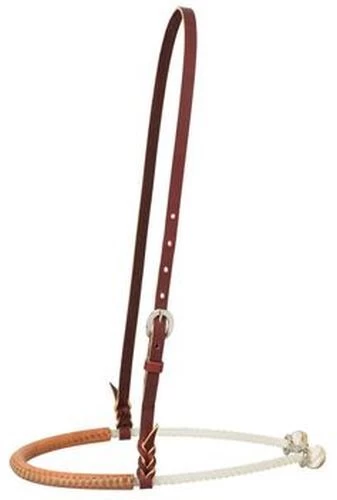 These leather covered rope nosebands are handcrafted from medium soft lay lariat rope and covered in russet harness leather with rawhide lacing. Choose from 3/8″ single rope or 1/4″ double rope.